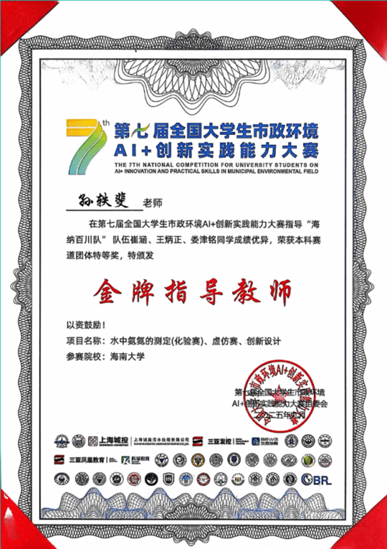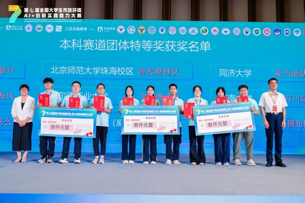 2025 年 9 月 20 日至 21 日,第七届全国大学生市政环境 AI + 创新实践能力大赛决赛在三亚市顺利举行。本届大赛由哈尔滨工业大学、同济大学、上海城投污水处理有限公司、三亚发展控股有限公司及北控水务集团有限公司联合主办,在规模上创下历届之最——共覆盖全国 179 所高校,吸引 671 支队伍参赛,汇聚了哈尔滨工业大学、同济大学、北京师范大学、天津大学、中山大学等国内顶尖院校,参赛阵容与竞争激烈程度均远超以往。在这场高规格的全国性赛事中,我院本科生团队凭借扎实的专业能力与创新实践成果,最终在全国决赛中斩获 “团体特等奖”。