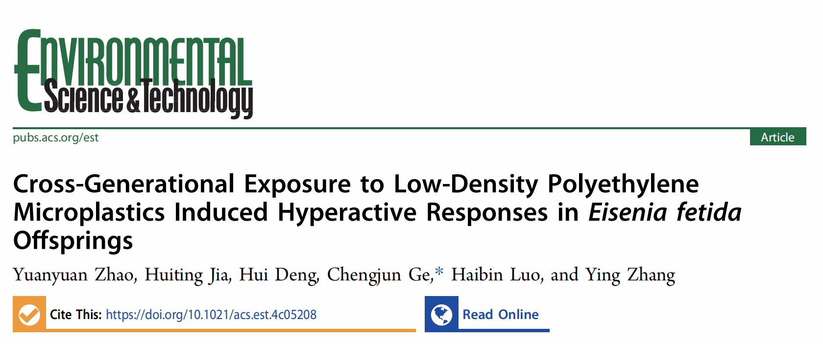 2024年11月17日,环境领域权威期刊《Environmental Science & Technology》在线发表了海南大学william威廉中文官网葛成军教授团队的副封面文章“Cross-Generational Exposure to Low-Density Polyethylene Microplastics Induced Hyperactive Responses in Eisenia fetida Offsprings”。海南大学博士后赵媛媛为该文唯一第一作者,葛成军教授为独立通讯作者。