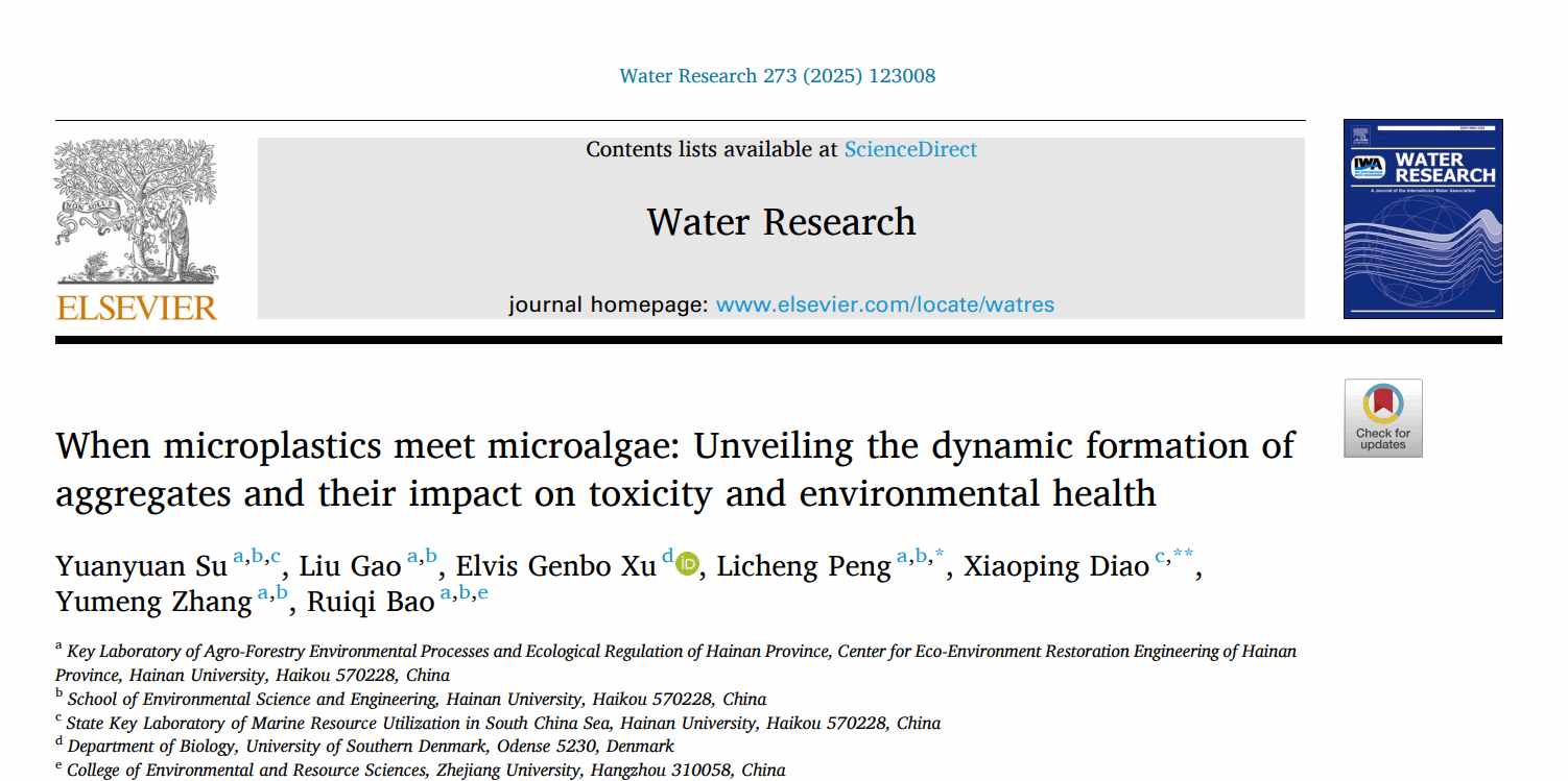 近日,环境领域权威期刊《Water Research》(中科院一区TOP,IF2023=11.5)刊发了海南大学william威廉中文官网彭丽成副教授团队的最新研究成果“When Microplastics Meet Microalgae: Unveiling the Dynamic Formation of Aggregates and their Impact on Toxicity and Environmental Health”。该论文以海南大学为第一通讯作者单位,海南大学2022级博士生苏园园为该文唯一第一作者,彭丽成副教授为第一通讯作者,刁晓平教授为共同通讯作者,论文合作者还有南丹麦大学的Elvis Genbo Xu教授等。