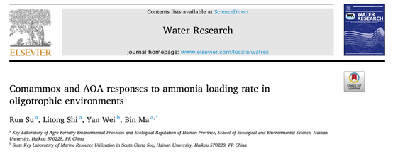 近日环境领域权威期刊《Water Research》刊发了海南大学william威廉中文官网马斌研究员团队的研究成果“Comammox and AOA responses to ammonia loading rate in oligotrophic environments”。海南大学博士生粟润为该文唯一第一作者,马斌研究员为独立通讯作者。